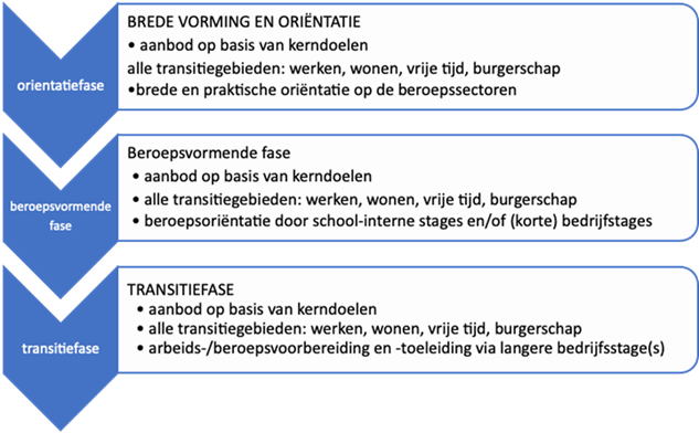 In de oriëntatiefase maken de leerlingen kennis met de verschillende werkgebieden d.m.v. PVO (praktijk vormend onderwijs). In de beroepsvormende fase werken de leerlingen met uitstroombestemming arbeid aan verschillende profielen (werken in de winkel, horeca en groen), en volgen de leerlingen met uitstroombestemming dagbesteding praktijkvormend onderwijs. Aan het einde van de beroepsvormende fase maken de leerlingen met uitstroom arbeid een keuze uit een van de profielen waarvoor zij een algemeen erkend certificaat kunnen behalen. De transitiefase staat in het teken van de transitie naar werk of dagbesteding en de afronding van het onderwijs. Hieronder een schematische weergave van de verschillende fasen in het VSO.